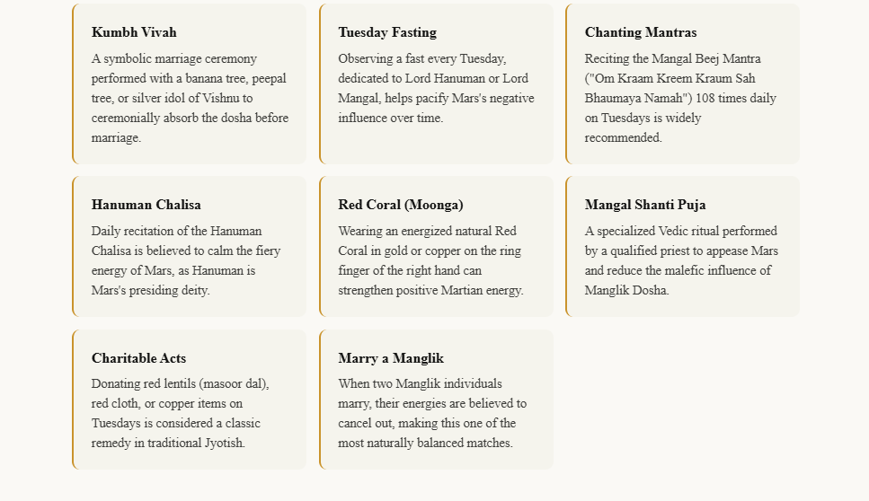 There is no single “best” remedy — a combination approach works best. Regular Tuesday fasting, Hanuman Chalisa recitation, Mangal Beej Mantra chanting, and — where applicable — Kumbh Vivah together provide comprehensive mitigation. Wearing a naturally energized Red Coral (after proper astrological consultation) can further support this.